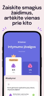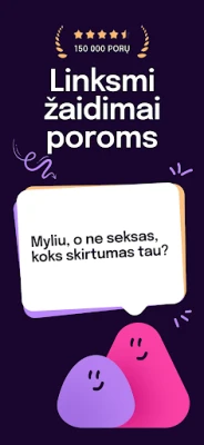 Nemlys kviečia poras atrasti naujas ryšio dimensijas ir įveikti bendravimo iššūkius su žaismingu lengvumu. Nesvarbu, ar esate ką tik pradėję kelionę kartu, ar jau ilgus metus dalijatės gyvenimu, Nemlys siūlo kruopščiai atrinktas porų viktorinas, gilius meilės klausimus ir įtraukiančius žaidimus, kurie skatina nuoširdžias diskusijas ir kuria nepamirštamas bendras akimirkas. Tai puiki priemonė jaustis arčiau vienas kito, net jei jus skiria atstumas, padedanti stiprinti emocinį ryšį ir palaikyti kibirkštį.