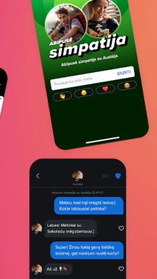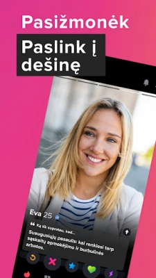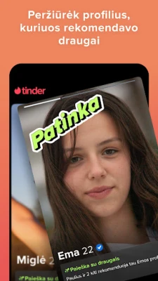 Pažinčių pasaulis su „Tinder" yra intuityvus ir įtraukiantis. Sukurti profilį yra paprasta: užpildykite jį ryškiausiomis savo nuotraukomis ir keliais žodžiais, atspindinčiais jūsų unikalumą, kad padidintumėte simpatijų tikimybę. Paprasčiausiai perbraukite dešinėn, jei kas nors patraukė jūsų akį, arba kairėn, jei ieškote kitų variantų. Jei simpatija abipusė, tai taps „match'u"! Ši dvišalio patvirtinimo sistema reiškia, kad bendrauti pradėsite tik tada, kai abiejų susidomėjimas bus tikras. Jokių nepatogių situacijų ar spaudimo – tik autentiškos galimybės sukurti prasmingus ryšius.