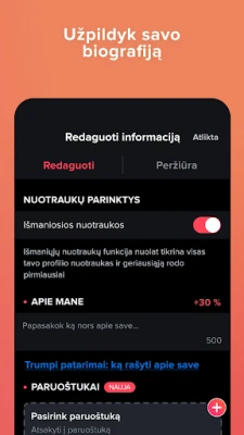 Norite išplėsti savo pažinčių galimybes? Pagerinkite savo patirtį su „Tinder Plus®", „Tinder Gold™" arba „Tinder Platinum™" prenumeratomis. Su „Tinder Gold™" galėsite matyti, kas jau jus pamėgo, mėgautis neribotu skaičiumi „patinka" paspaudimų ir galimybe atšaukti paskutinįjį perbraukimą. Funkcija „Tinder Pasas" leidžia susipažinti su žmonėmis bet kurioje pasaulio vietoje, o mėnesinis profilį iškylantis „Boost'as" padaro jūsų profilį vienu iš matomiausių trisdešimčiai minučių. Be to, gausite savaitinį „Super Like'ą" tiems ypatingiems atvejams. Pasirinkę „Tinder Platinum™", gaukite prioritetinius „patinka" ir unikalią galimybę parašyti žinutę dar prieš tampant „match'u". „Tinder Plus®" siūlo neribotus „patinka", atšaukimus ir „Pasą". Pasirinkite lygį, kuris geriausiai atitinka jūsų pažinčių kelionę.