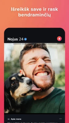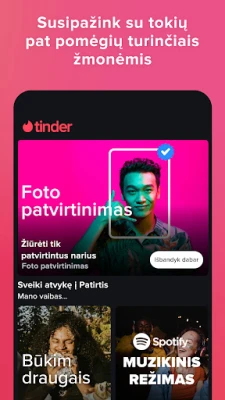 Prisijunkite prie gyvybingos bendruomenės, kurioje jūsų autentiškumas yra švenčiamas ir palaikomas. Nesvarbu, kokia jūsų orientacija – heteroseksualus, gėjus, biseksualus ar lesbietė – „Tinder" kviečia būti savimi ir atrasti ryšius, kurių ieškote. Pasidalinkite savo pomėgiais, sužinokite daugiau apie potencialias simpatijas ir kurkite nuostabius pokalbius. Mūsų nuotraukų patvirtinimas užtikrina, kad vienintelė staigmena per jūsų pirmąjį pasimatymą bus nuoširdi šypsena, o virtualūs pokalbiai leis pajusti chemiją tiesiai iš savo patogios sofos. Keliaujate po pasaulį? Atraskite vietinius ir susijunkite su žmonėmis bet kurioje vietoje – nuo Vilniaus širdies iki judrios Barselonos. Nauja meilė, įdomus pasimatymas ar tiesiog draugiški susitikimai – „Tinder" lydi jus jūsų kelionėje.