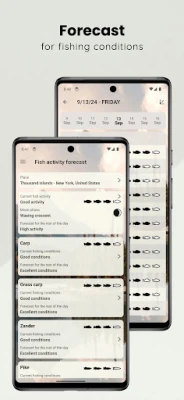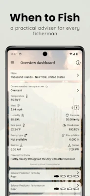 Norėdami maksimaliai padidinti sėkmės tikimybę, pasinaudokite išsamiais orų duomenimis, apimančiais temperatūrą, slėgį, vėją ir kitus svarbius veiksnius, kurie tiesiogiai veikia žuvų elgesį. Sekite Mėnulio fazes, kurios turi įtakos žuvų aktyvumui, ir pasinaudokite Solunar kalendoriaus prognozėmis, rodančiomis geriausią žvejybos laiką kiekvienai dienai ir valandai. Įmontuotas barometras padės numatyti slėgio pokyčius ir atitinkamai planuoti išvykas. Išsaugokite savo mėgstamas žvejybos vietas ir, turėdami premium prieigą, dalinkitės jomis bei tyrinėkite kitų sėkmingas vietas. Naujausia versija pristato patobulintą žemėlapį su keliais žymeklių tipais ir išsamų žvejybos dienoraštį, kuriame galėsite fiksuoti laimikį (su nuotraukomis), orus ir vietą, taip pat eksportuoti bei importuoti įrašus.