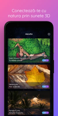 Kai meditacinė būsena susilieja su atpalaiduojančia muzika, minčių ir vaizduotės galia, patirsite gyvybingų ir gilių įžvalgų. Išmoksite geriau tyrinėti savo vidinį pasaulį ir atrasite naujas laisvės, įkvėpimo, pusiausvyros ir laimės dimensijas. Vedamos meditacijos, stimuliuodamos tam tikras smegenų struktūras, padeda atblokuoti emocijas, sustiprina ir palaiko gerovės būseną, didina jautrumą muzikai, atvirumą dvasingumui, intuicijai, abstrakčiam mąstymui ir empatijai. Mobilizuodama pasąmonę palaikyti sąmoningas mintis ir tikslus, ji ugdo vidinę jėgą ir motyvaciją siekti savo troškimų ir svajonių. Be to, mėgausitės aštuonių vedamų kvėpavimo technikų privalumais, kurios padės atgauti ramybę ir vidinę pusiausvyrą bet kurioje situacijoje, o 3D garso technologija leis virtualiai keliauti į gamtos prieglobstį.